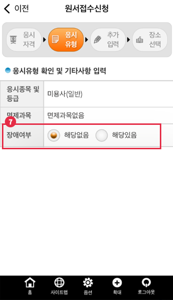 학력 , 수료상태 , 경제활동상태, 응시목적, 시험준비경로, 시험준비기간을 빠르게 체크해서 다음 누르기